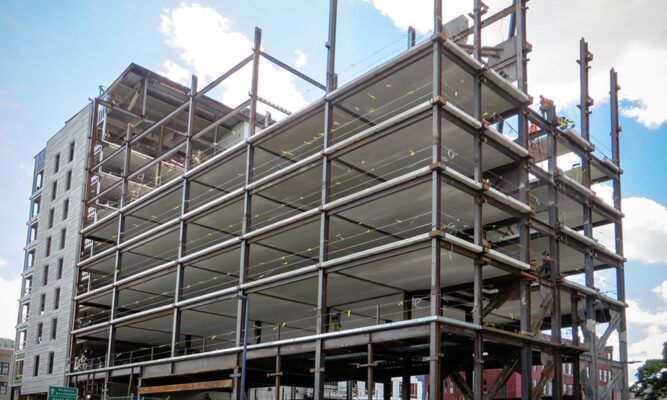 The structure formed by steel construction is preferred because it is reliable and requires less raw material than other types of structures.
